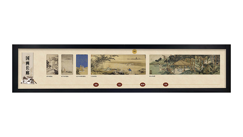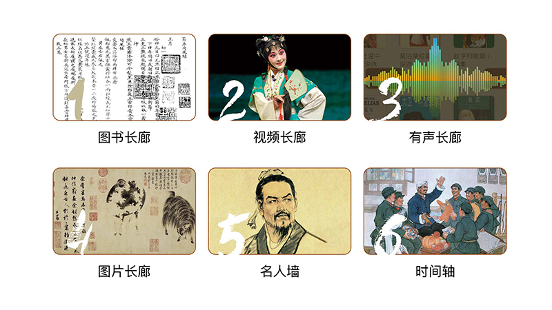 文化長廊展示系統(tǒng)由多塊屏幕拼接而成,界面由一個無限循環(huán)的軸組成,由左至右緩緩流動、宛如歷史長河源遠流長,孕育出不一樣的知識服務(wù)。
