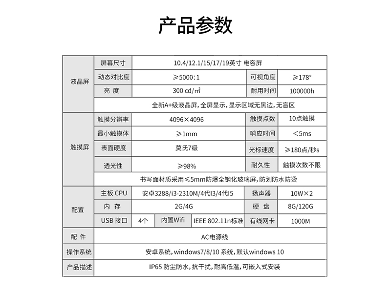 產(chǎn)品概述: 工控一體機又名工業(yè)控制計算機,是專門為工業(yè)控制設(shè)計的計算機,憑借著其輕薄精巧的外觀,簡單的操作,強大的功能,在行業(yè)中占據(jù)著不可或缺的位置。全鋁結(jié)構(gòu),被動散熱,無風(fēng)扇設(shè)計,支持安裝X86/安桌/顯示器主板,前面板支持IP65等級防護(hù),安裝結(jié)構(gòu)兼容桌面式、壁掛式、嵌入式。 產(chǎn)品特點: 多種高清分辨率可選,擁有100%sRGB色域,還原真實色彩; IPS高清屏,178°超廣視角,每一個角度都可以完美呈現(xiàn); 有效過濾380-445nm波段的藍(lán)光,長時間觀看不累眼,守護(hù)眼睛; 使用高強度工業(yè)級邊框,穩(wěn)固結(jié)實,放撞放刮,惡劣環(huán)境可使用; IP65級防塵防水,耐高低溫,-10°C~70°C皆可正常運行,擁有超強抗干擾能力; 工業(yè)級應(yīng)用,全年24小時持續(xù)運行,使用穩(wěn)定且耗能低; 十指觸控,手指點擊屏幕快速響應(yīng),多種快捷手勢等你探索; 外嵌式安裝,靈活應(yīng)用于多種場景,增加了使用的便捷性;