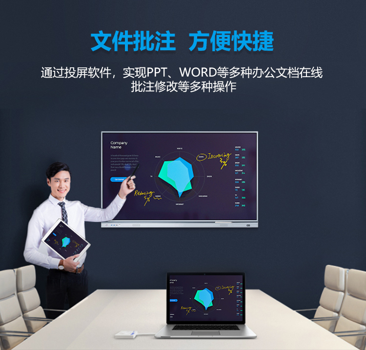 在公司形象展示、產品介紹、員工培訓教學中,其高清晰顯示屏解決了投影機前投光線刺眼的問題,而且無需關閉燈關,無需關閉窗簾等繁雜會前準備,無盲點完全觸摸、全程互動、及多媒體展示,使得會議生動有趣。