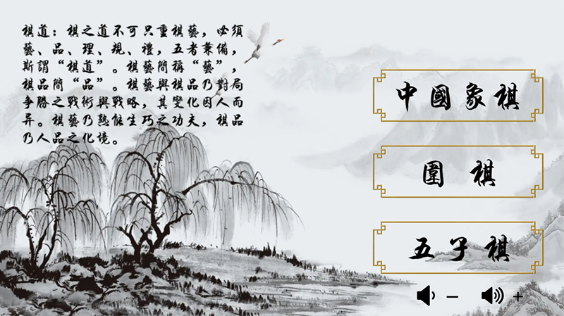 棋者,奕也。下棋者,藝也。博弈是東方文化生活的重經組成部分,它不但不同于一般的消遣游戲,還影響和陶冶著人們的道德觀念、行為準則、審美趣味和思維方式。琴、棋、書、畫并稱中國四大傳統藝術形式,成為一種具有豐富內涵的文化形態。“弈”中的恬淡、豁達、風雅、機智和軍事、哲學、詩詞、藝術共聚一堂。黑白之間,楚河漢界內外,棋藝帶來的啟悟和內涵被無限拓展,棋盤之外的天地被融合為一,成為中國棋文化的最大特點之一。方寸棋盤,還具有磨煉人的意志,陶冶人的情操,振奮民族精神的作用。
