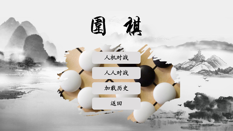 “圍棋,是一種策略型兩人棋類游戲,中國古時稱“弈”,西方名稱“Go”。流行于東亞國家(中、日、韓、朝),屬琴棋書畫四藝之一。圍棋起源于中國,傳為帝堯所作,春秋戰國時期即有記載。隋唐時經朝鮮傳入日本,流傳到歐美各國。圍棋蘊含著中華文化的豐富內涵,它是中國文化與文明的體現。” 電子棋桌圍棋首頁:可選擇對戰模式或加載之前保存的棋局。